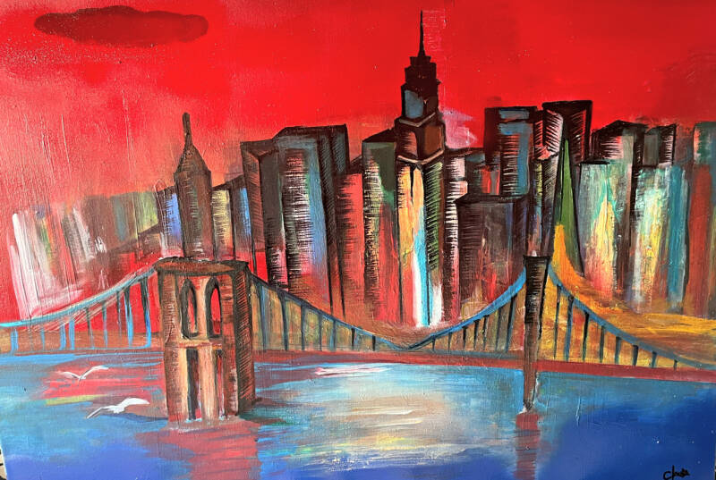 Un’esplosione di colori e contrasti che trasforma New York in una visione infuocata, pulsante di energia e passione. Il cielo rosso intenso domina la scena, mentre i grattacieli sembrano vibrare di luce e movimento. Il Brooklyn Bridge, saldo e imponente, collega passato e futuro in un paesaggio urbano che sembra respirare. Un’opera potente, vibrante, che cattura l’anima ribelle della città.l